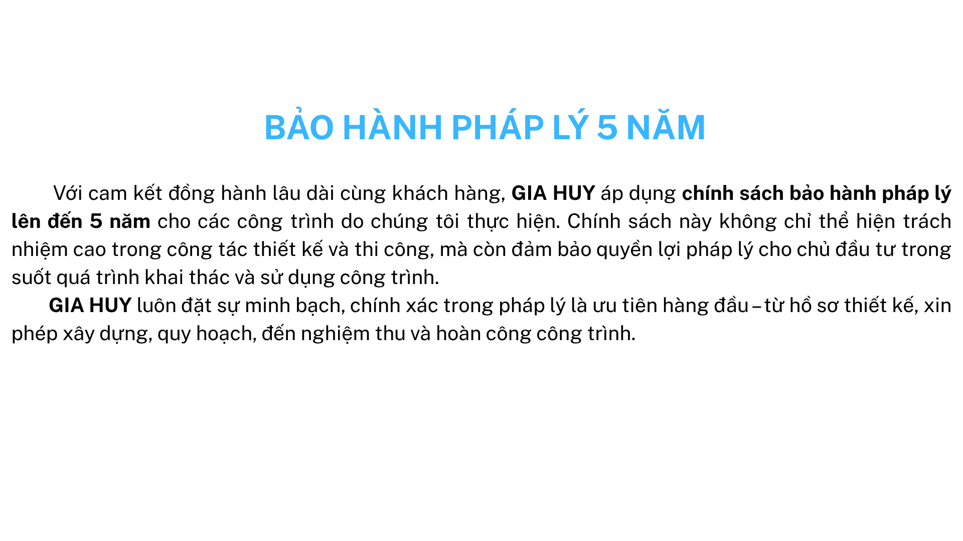 Công ty GIA HUY cam kết chất lượng công trình bằng chính sách bảo hành lên đến 5 năm, giúp khách hàng an tâm tuyệt đối sau khi bàn giao …